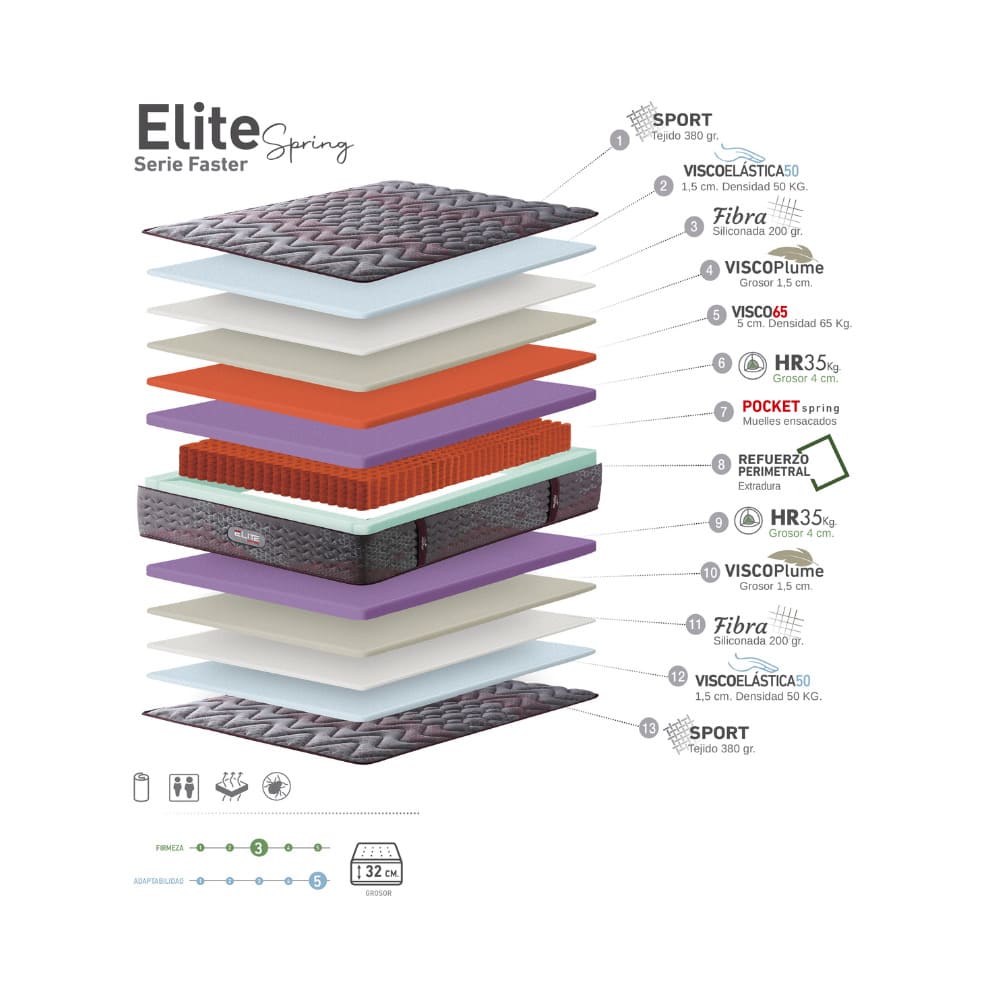 El Elite Spring está diseñado para ofrecer un descanso de alta calidad, combinando adaptabilidad, firmeza y tecnología avanzada. Con sus 32 cm de grosor, proporciona una sensación envolvente que favorece un sueño profundo y reparador, especialmente pensado para personas activas y deportistas. Su núcleo de muelles ensacados con refuerzo perimetral extradura garantiza una firmeza óptima y una excelente independencia de movimientos. Las capas de viscoelástica de distintas densidades se ajustan perfectamente a cada zona del cuerpo, ayudando a liberar tensiones y favoreciendo la recuperación muscular mientras duermes. Se puede usar en ambas caras. Elite Spring es mucho más que un colchón: es tu mejor aliado para despertar con energía y bienestar cada día.