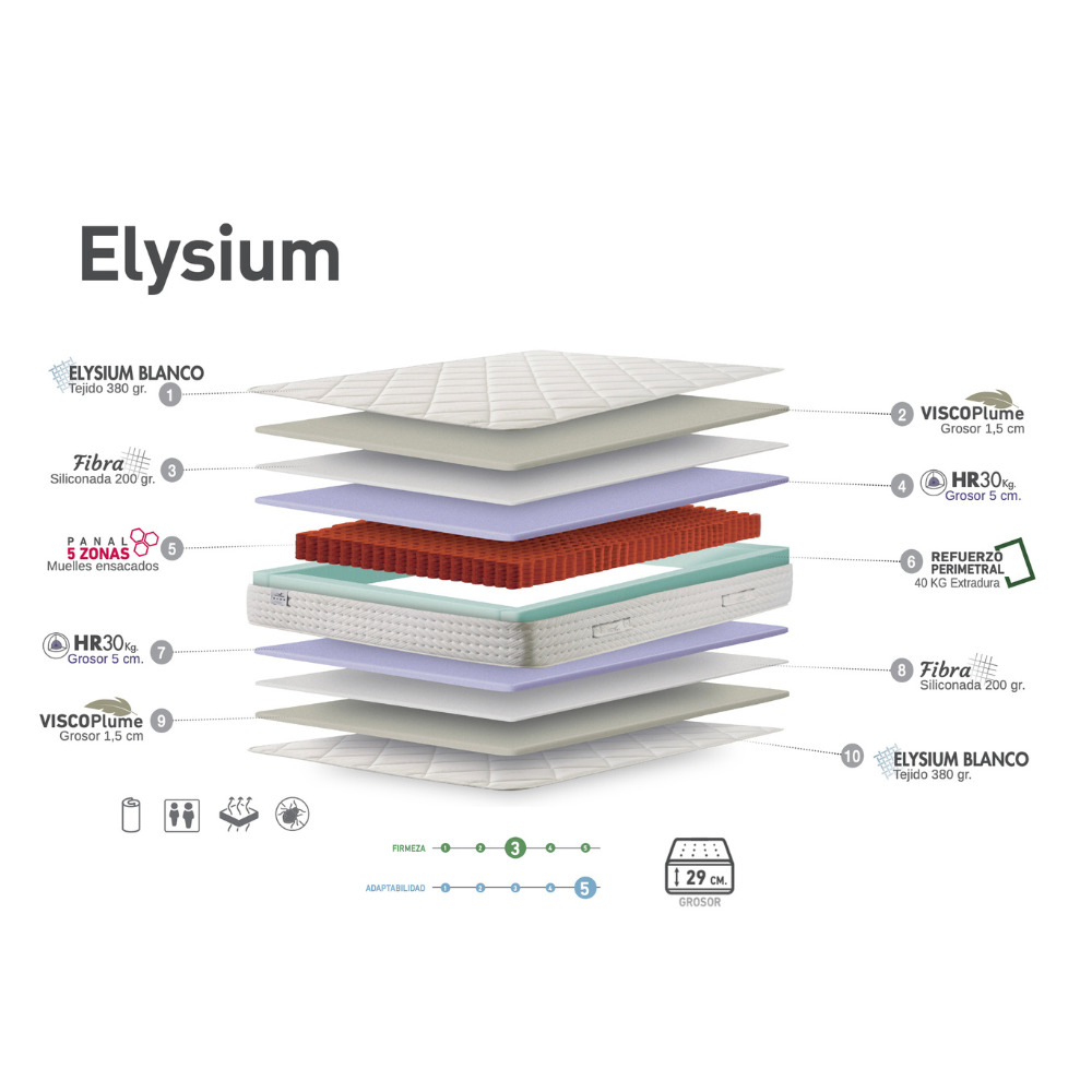 El colchón Elysium representa la esencia del descanso refinado. Con una altura de 29 cm, este modelo ha sido elaborado con una cuidada selección de materiales de calidad para ofrecer una experiencia de confort única y duradera.
